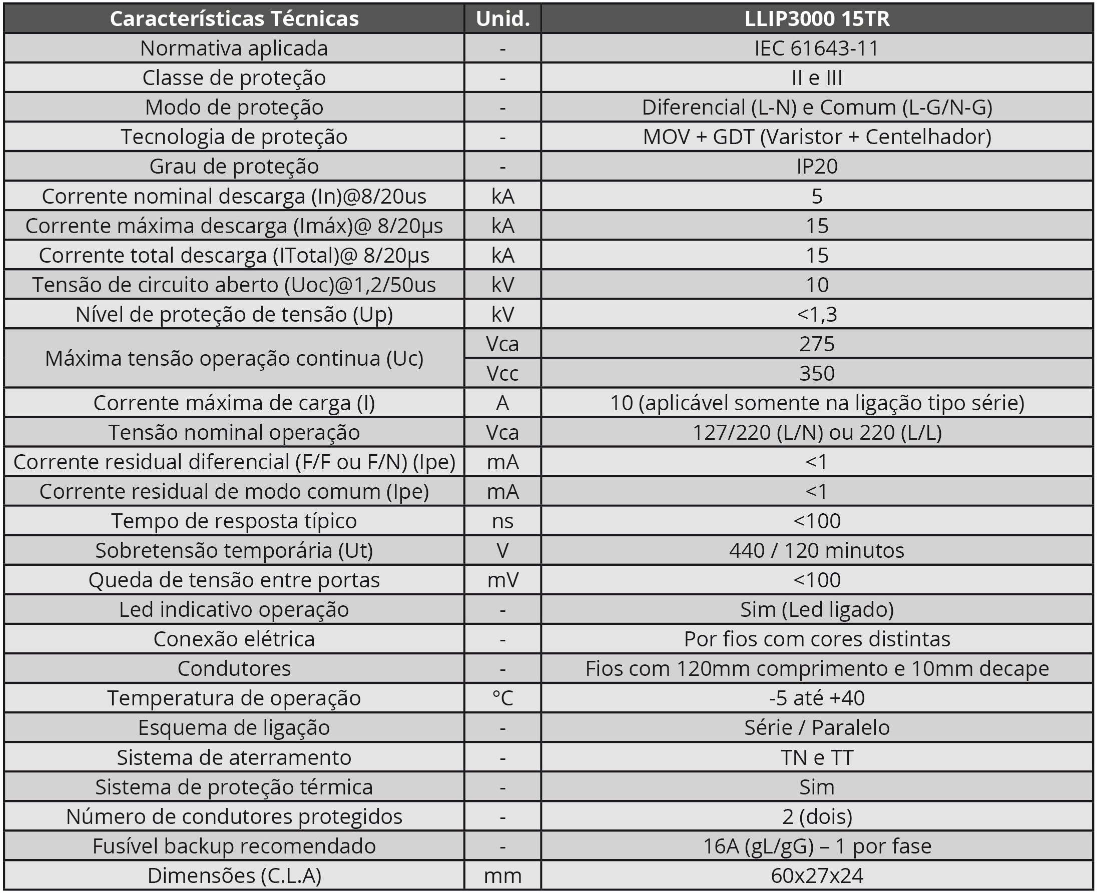 • Proteção contra surto: 15kA;